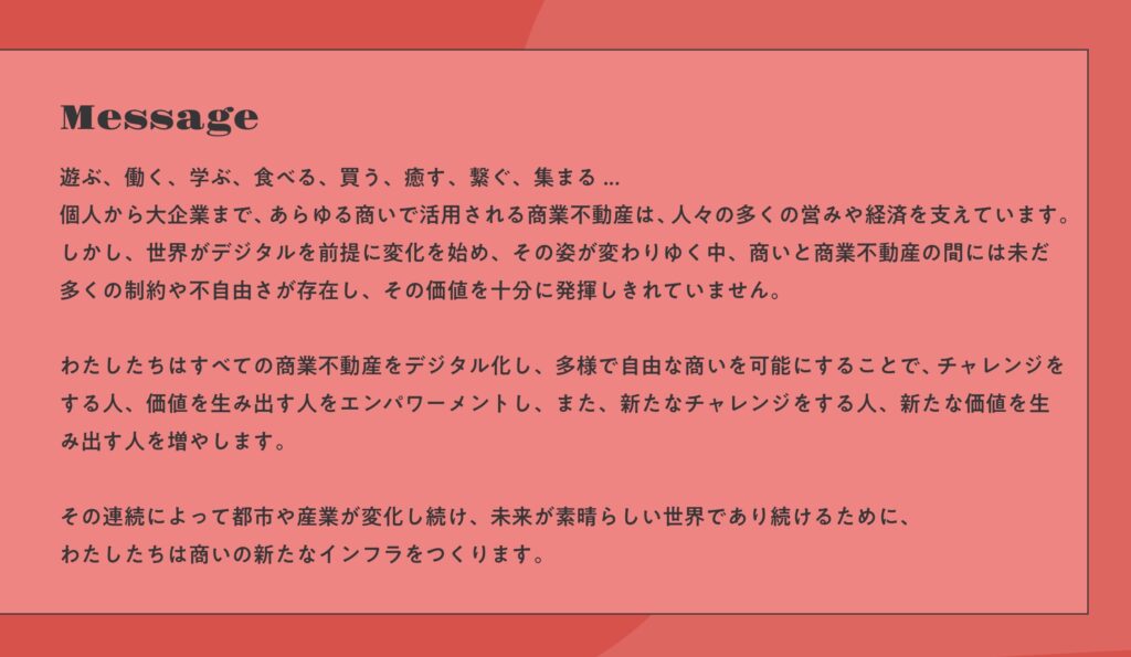 わたしたちはすべての商業不動産をデジタル化し、多様で自由な商いを可能にすることで、チャレンジをする人、価値を生み出す人をエンパワーメントし、また、新たなチャレンジをする人、新たな価値を生み出す人を増やします。