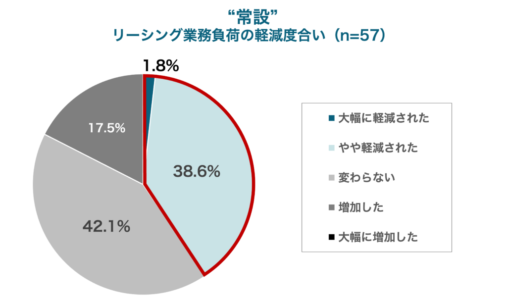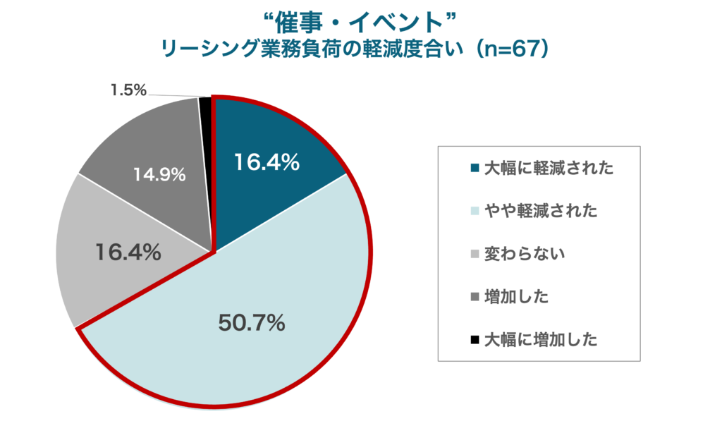 なお、回答いただいた方の業務属性(催事・イベント/常設)によって比較したところ、「催事・イベント」担当者で約7割、「常設」担当者で約4割が業務負荷の軽減を感じていました。短期間での出店となる「催事・イベント」の場合、本来であれば実施回数の増加に伴い、後続のオペレーションも増加傾向になりますが、ショップカウンター エンタープライズによって、出店までの手続き管理や、オンラインによる契約・請求対応などリーシングに伴う各種業務の改善効果をより得やすい傾向が見られました。