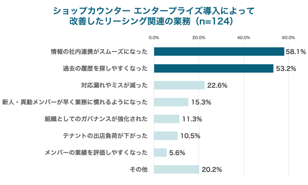 続いてショップカウンター エンタープライズを導入したことによって具体的に改善したリーシング関連の業務内容についてを尋ねたところ、1位「情報の社内連携がスムーズになった」(58.1%)、2位「過去の履歴を探しやすくなった」(53.2%)が上位に挙げられました。多くの商業施設がこれまでアナログかつ属人的な情報管理を行っており、情報の資産化・データベース化ができていなかったと言えるでしょう。
