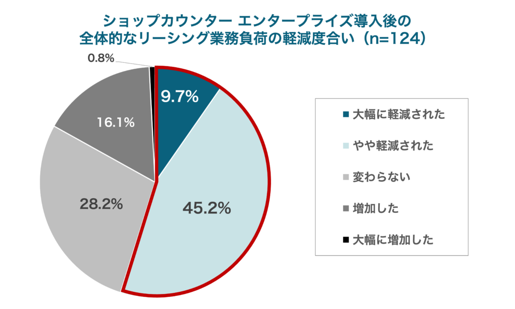 このたびショップカウンター エンタープライズを導入いただいた商業施設の担当者124人を対象に、導入後の全体的なリーシング業務負荷の軽減度合いを尋ねたところ、5割超が軽減されたと回答しました(大幅に軽減された:9.7%、やや軽減された:45.2%の合計)。一方で、業界的にこれまで「オンラインリーシング」を行っておらず、同システム導入による新たな試みとして“テナント募集サイト”を通じた新規の問い合わせ数が急増したことに伴い、全体的な業務量の増加を感じる人も16.9%(増加した:16.1%、大幅に増加した:0.8%の合計)存在する結果にもなりました。