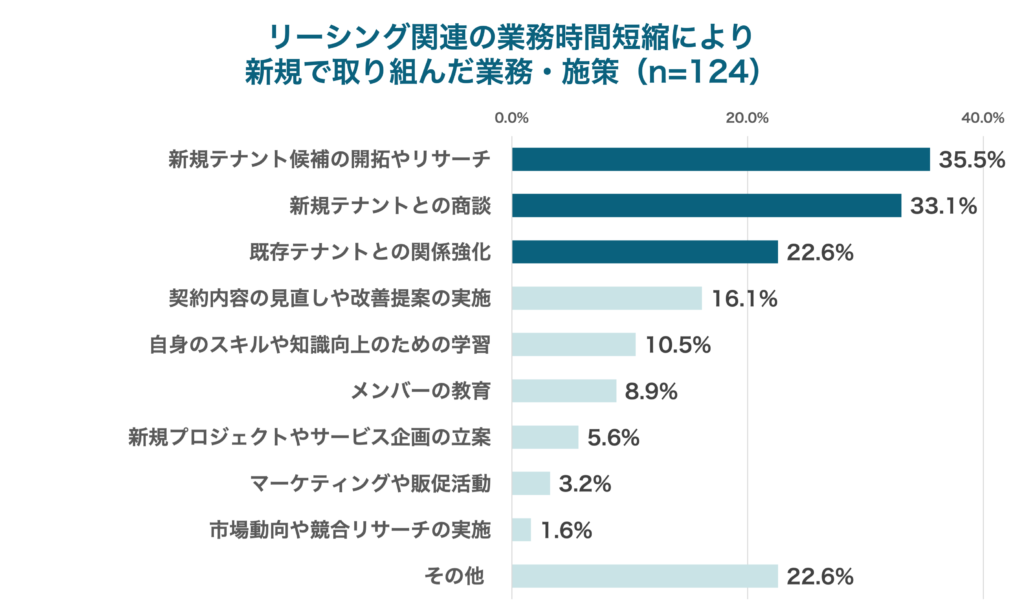 さらに、ショップカウンター エンタープライズ導入後、リーシング関連の業務時間が短縮したことによって新たに取り組めることになった業務・施策が何かを尋ねたところ、「新規テナント候補の開拓やリサーチ」(35.5%)、「新規テナントとの商談」(33.1%)、「既存テナントとの関係強化」(22.6%)がTOP3となりました。