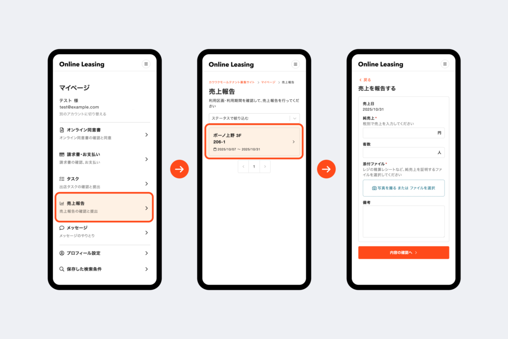 「売上報告機能」では、テナントが出店当日の営業終了後にマイページから純売上や客数を入力し、レジ締めレシートなどの証憑をアップロードすることで、簡単に報告を完了できます。報告状況は「未報告」「確認待ち」「確認済み」といったステータスで自動的に管理され、施設担当者は報告漏れの有無を即座に把握することが可能です。